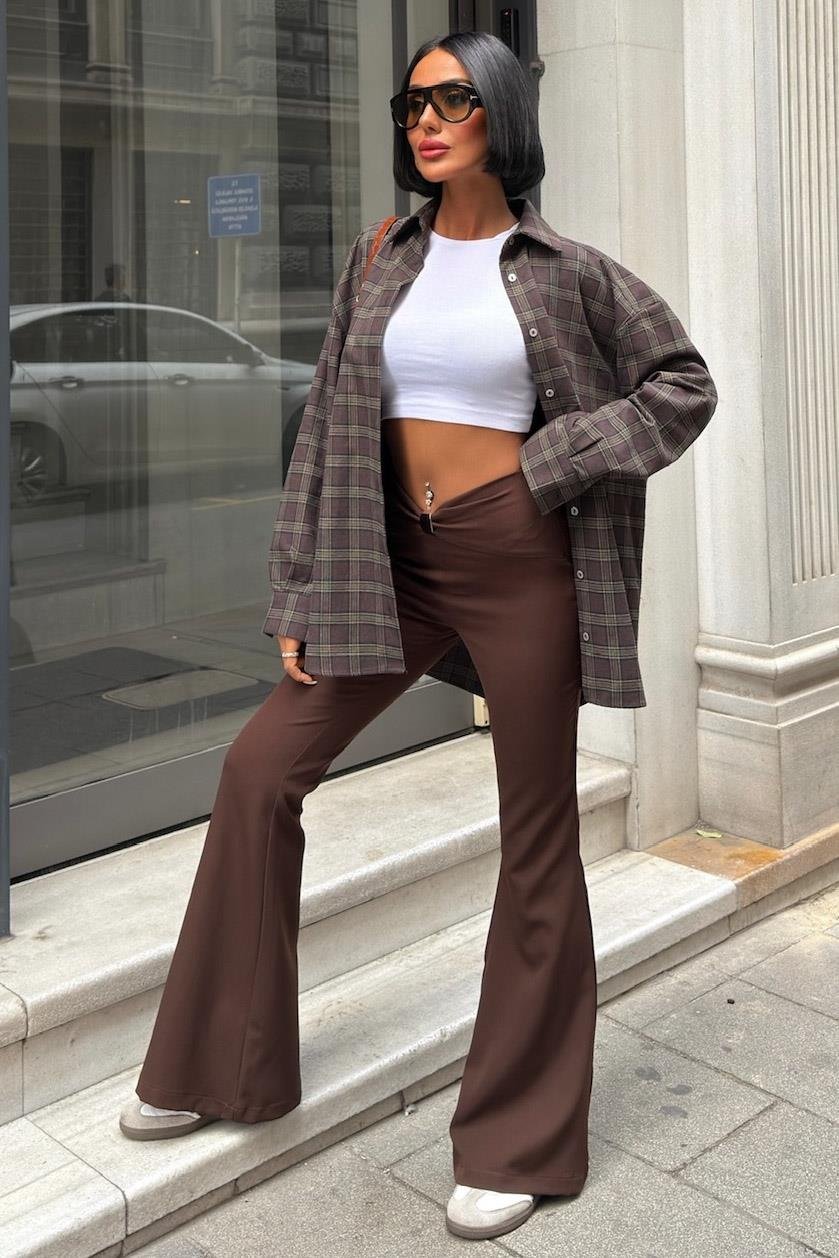 High-Waist Flared Pants with Front Clasp Detail – Elegant Double Fabric Trousers for Women