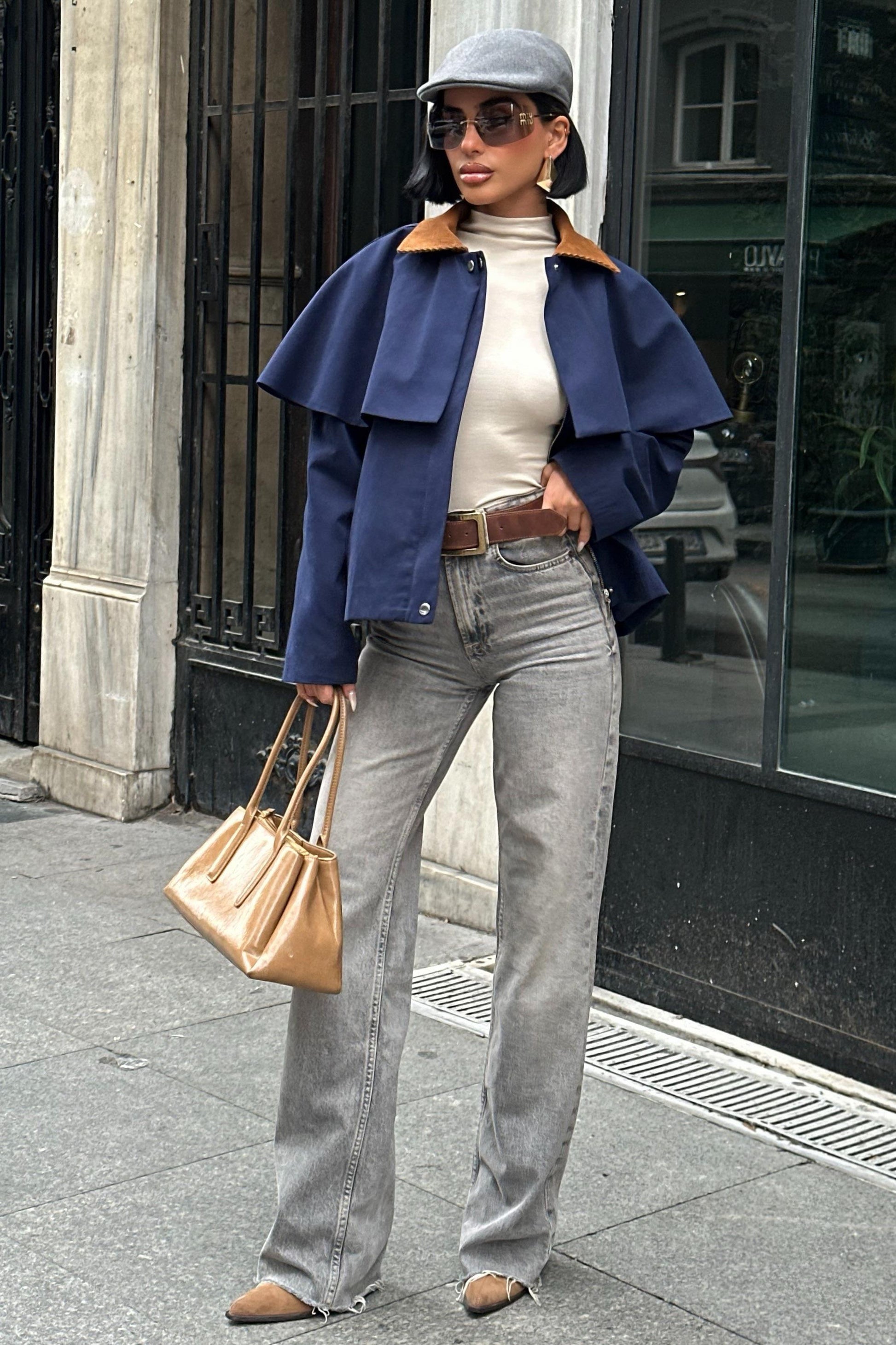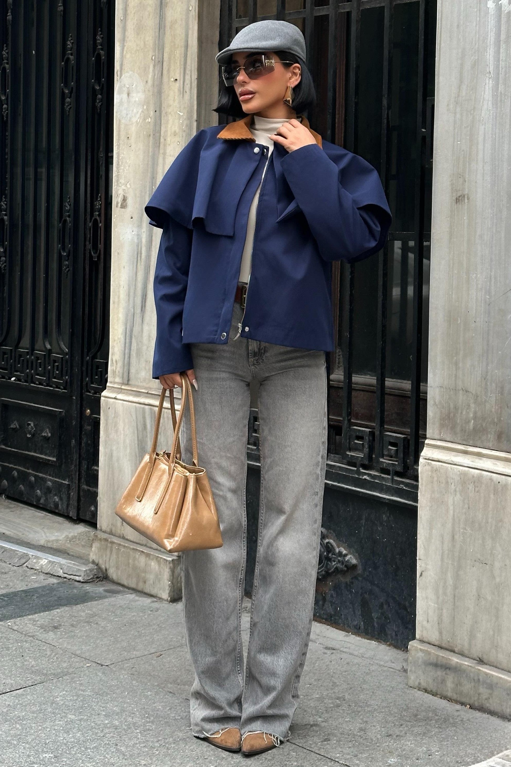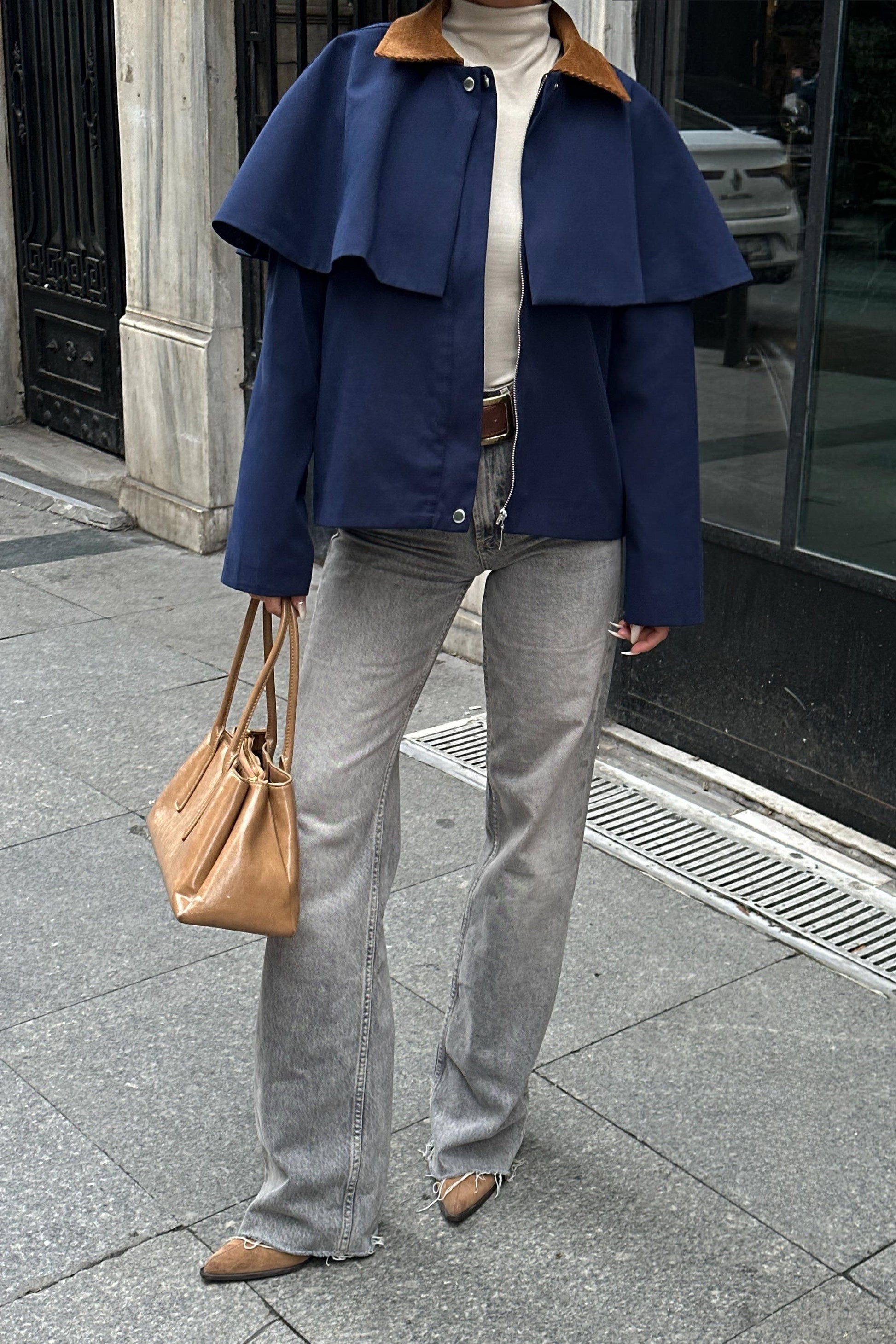 Cape-Style Trench Jacket with Velvet Collar – Short Cotton Blend Coat – Navy Blue