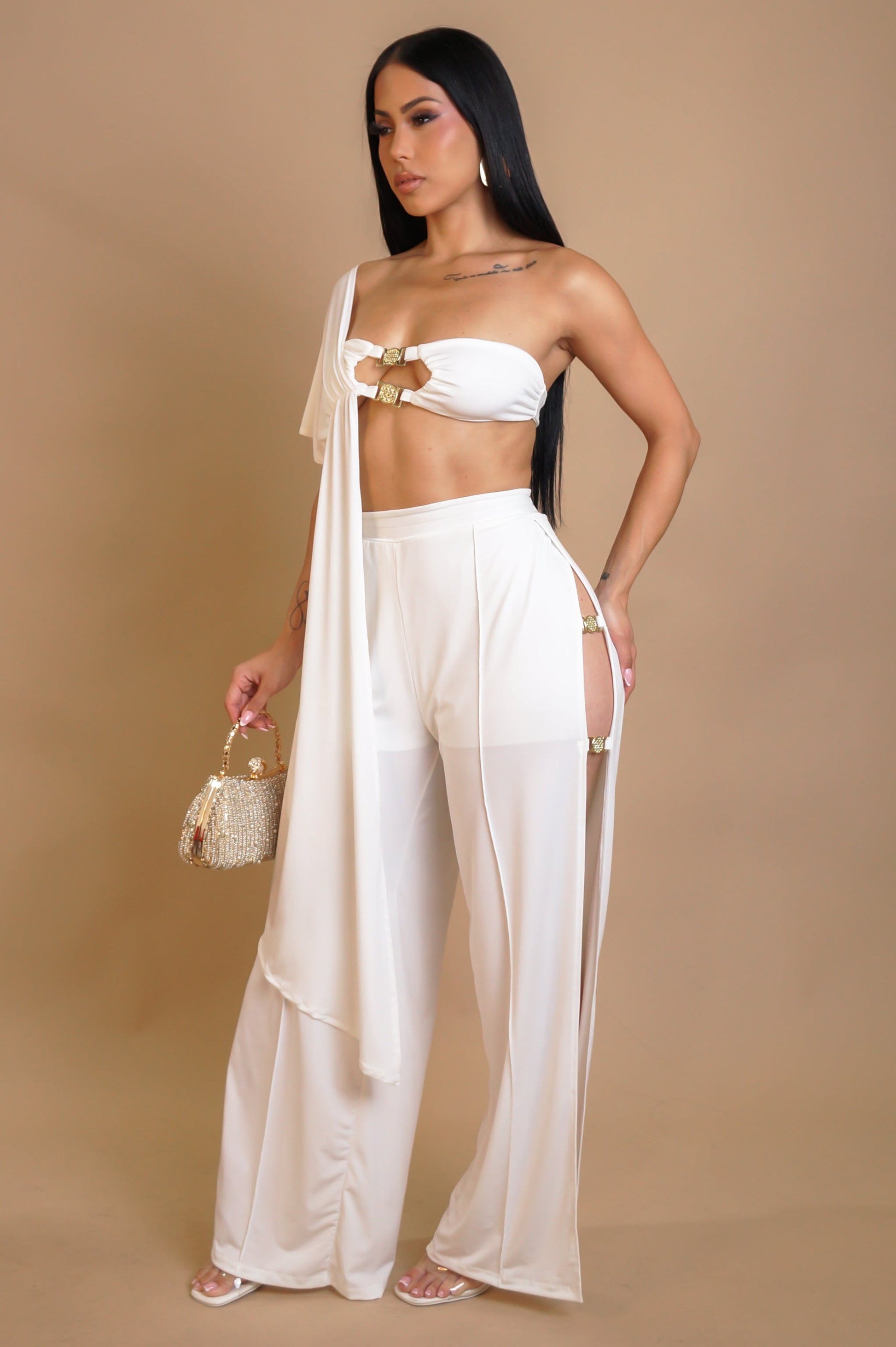 Transform your wardrobe with the Draped Aura Pant Set. Made from a luxurious blend of 95% poly and 5% spandex, this set offers ultimate comfort and style. The elegant white color and stretchy fabric will make you stand out, making it a must-have for any occasion!